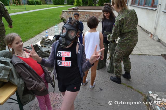 Program odštartoval preskúšaním z pohybovej výkonnosti v ich športovom areáli, ktoré riadil telovýchovný pracovník vrtuľníkového krídla Miroslav Štubňa. Deti museli vykonávať základné disciplíny preskúšania profesionálnych vojakov z telovýchovy – sed-ľah, člnkový beh, skok do diaľky, zhyby na hrazde a 12 min. beh, presne podľa pokynov a na časové normy. Ďalej sme pokračovali šplhaním na lane a súťaži v klikovaní. Veľkou výzvou bol beh s nasadenou maskou a jednorázovou pláštenkou JP-75. Viacerí ju zvládli na výbornú. Po krátkom odpočinku sme pokračovali ukážkami zbrane Sa vz.58, nosného modulárneho systému a chemických ochranných prostriedkov, ktoré používajú vojaci pri výcviku.